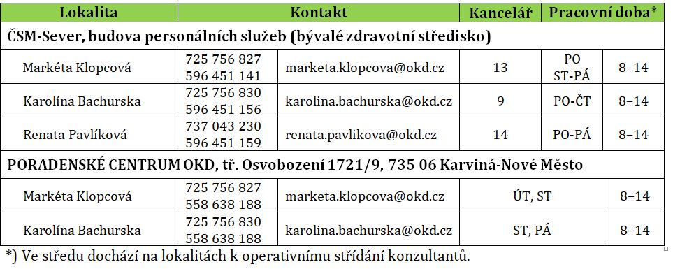 Od 10. ledna 2022 budou kanceláře Nové šichty v provozu pouze na lokalitě Dolu ČSM-Sever v přízemí budovy personálních služeb (bývalého zdravotního střediska) a v Poradenském centru OKD v Karviné na ulici tř. Osvobození 1721/9. Kanceláře na lokalitě Darkov budou od uvedeného data uzavřeny. Více informací najdete v kontaktech. Nové kontaktní údaje naleznete v přiloženém letáku, či v sekci PRÁCE NA DOSAH/KONTAKTY.