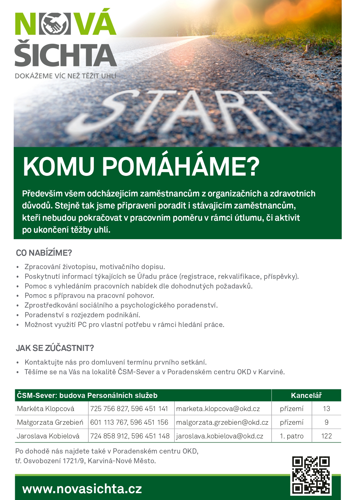 Nová šichta je dobrovolný program společnosti OKD fungující od roku 2014. Náš tým tvoří přímo zaměstnanci personálního oddělní a jsme připraveni poradit i prakticky pomoci. Nová šichta je určena zejména zaměstnancům, kteří se nechystají do starobního důchodu, a budou aktivně hledat další zaměstnání. Pomyslnou pomocnou ruku nabízíme odcházejícím zaměstnancům, ať už z organizačních či zdravotních důvodů. Navštívit nás ale může i stávající zaměstnanec, jehož pracovní poměr nebude pokračovat v rámci útlumu nebo aktivit po ukončení těžby uhlí.